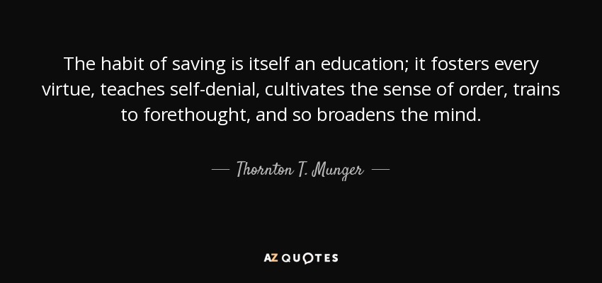 The habit of saving is itself an education; it fosters every virtue, teaches self-denial, cultivates the sense of order, trains to forethought, and so broadens the mind.