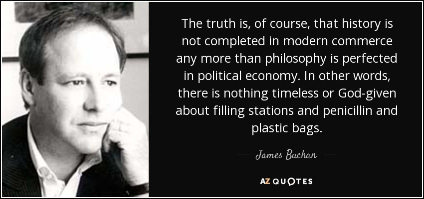 The truth is, of course, that history is not completed in modern commerce any more than philosophy is perfected in political economy. In other words, there is nothing timeless or God-given about filling stations and penicillin and plastic bags.