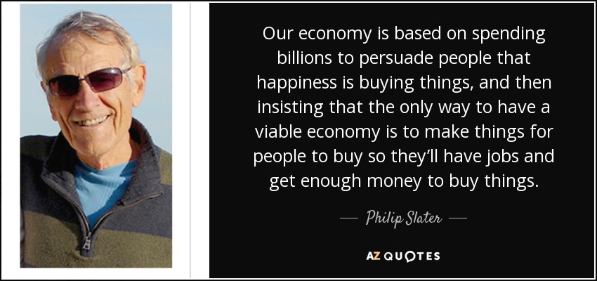 Our economy is based on spending billions to persuade people that happiness is buying things, and then insisting that the only way to have a viable economy is to make things for people to buy so they’ll have jobs and get enough money to buy things.