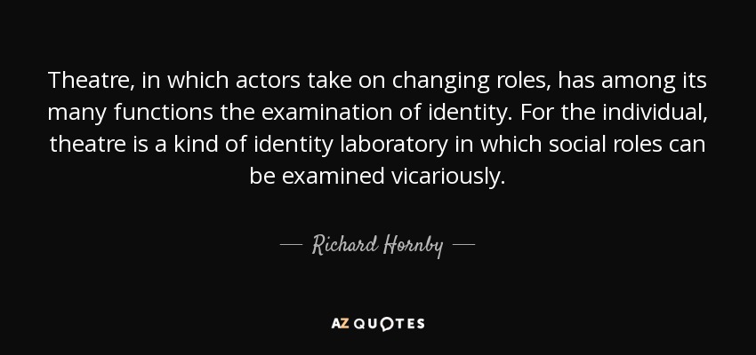 Theatre, in which actors take on changing roles, has among its many functions the examination of identity. For the individual, theatre is a kind of identity laboratory in which social roles can be examined vicariously.