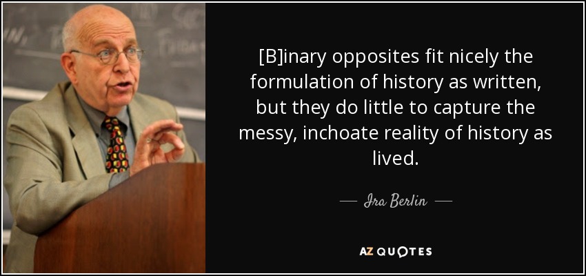 [B]inary opposites fit nicely the formulation of history as written, but they do little to capture the messy, inchoate reality of history as lived.