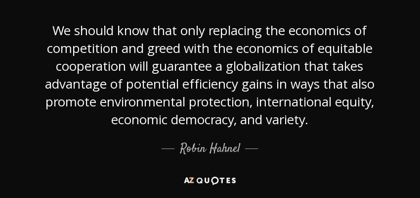 We should know that only replacing the economics of competition and greed with the economics of equitable cooperation will guarantee a globalization that takes advantage of potential efficiency gains in ways that also promote environmental protection, international equity, economic democracy, and variety.