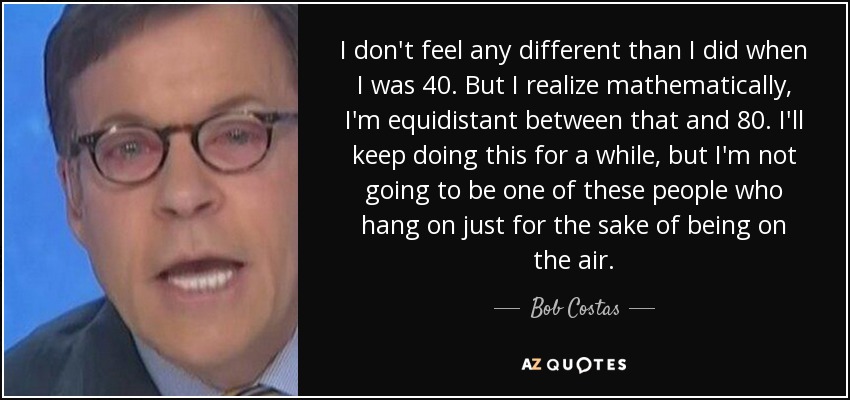 I don't feel any different than I did when I was 40. But I realize mathematically, I'm equidistant between that and 80. I'll keep doing this for a while, but I'm not going to be one of these people who hang on just for the sake of being on the air.