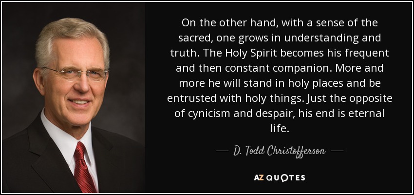 On the other hand, with a sense of the sacred, one grows in understanding and truth. The Holy Spirit becomes his frequent and then constant companion. More and more he will stand in holy places and be entrusted with holy things. Just the opposite of cynicism and despair, his end is eternal life.