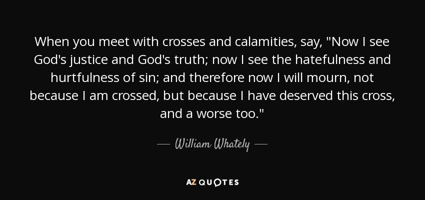 When you meet with crosses and calamities, say, "Now I see God's justice and God's truth; now I see the hatefulness and hurtfulness of sin; and therefore now I will mourn, not because I am crossed, but because I have deserved this cross, and a worse too."