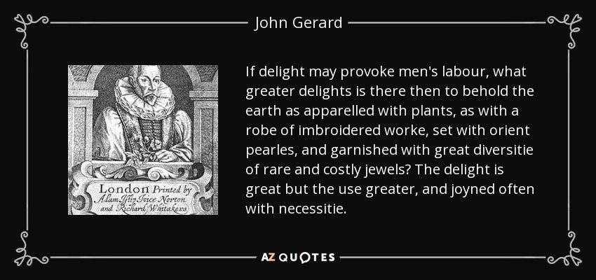 If delight may provoke men's labour, what greater delights is there then to behold the earth as apparelled with plants, as with a robe of imbroidered worke, set with orient pearles, and garnished with great diversitie of rare and costly jewels? The delight is great but the use greater, and joyned often with necessitie.