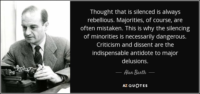 Thought that is silenced is always rebellious. Majorities, of course, are often mistaken. This is why the silencing of minorities is necessarily dangerous. Criticism and dissent are the indispensable antidote to major delusions.