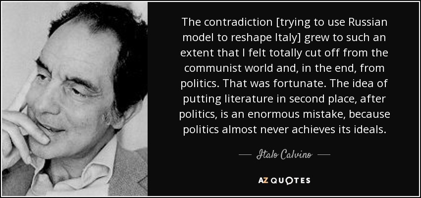 The contradiction [trying to use Russian model to reshape Italy] grew to such an extent that I felt totally cut off from the communist world and, in the end, from politics. That was fortunate. The idea of putting literature in second place, after politics, is an enormous mistake, because politics almost never achieves its ideals.