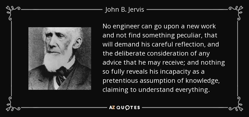 No engineer can go upon a new work and not find something peculiar, that will demand his careful reflection, and the deliberate consideration of any advice that he may receive; and nothing so fully reveals his incapacity as a pretentious assumption of knowledge, claiming to understand everything.
