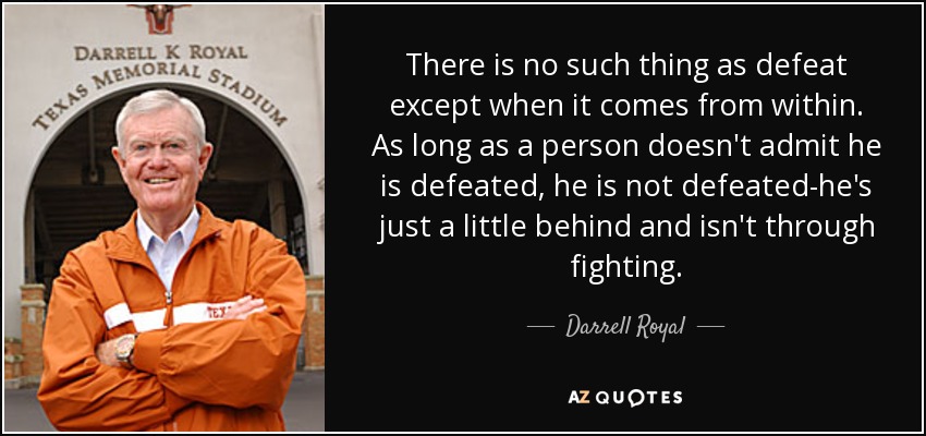 There is no such thing as defeat except when it comes from within. As long as a person doesn't admit he is defeated, he is not defeated-he's just a little behind and isn't through fighting.