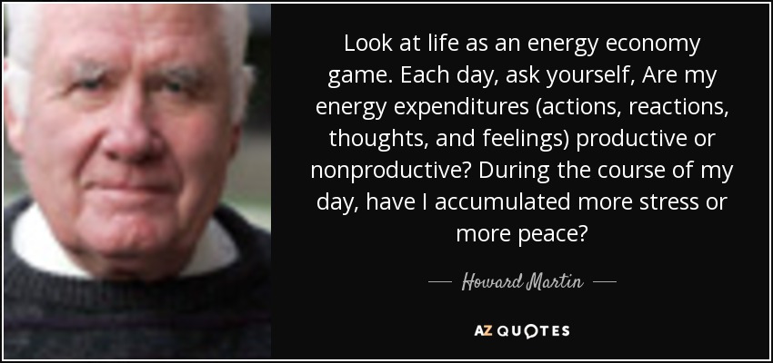 Look at life as an energy economy game. Each day, ask yourself, Are my energy expenditures (actions, reactions, thoughts, and feelings) productive or nonproductive? During the course of my day, have I accumulated more stress or more peace?