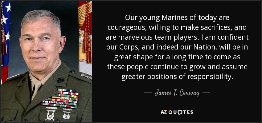 Our young Marines of today are courageous, willing to make sacrifices, and are marvelous team players. I am confident our Corps, and indeed our Nation, will be in great shape for a long time to come as these people continue to grow and assume greater positions of responsibility.