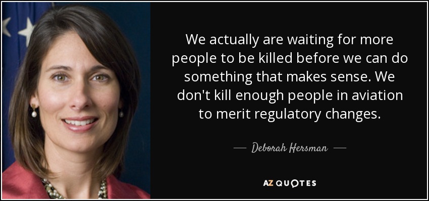 We actually are waiting for more people to be killed before we can do something that makes sense. We don't kill enough people in aviation to merit regulatory changes.