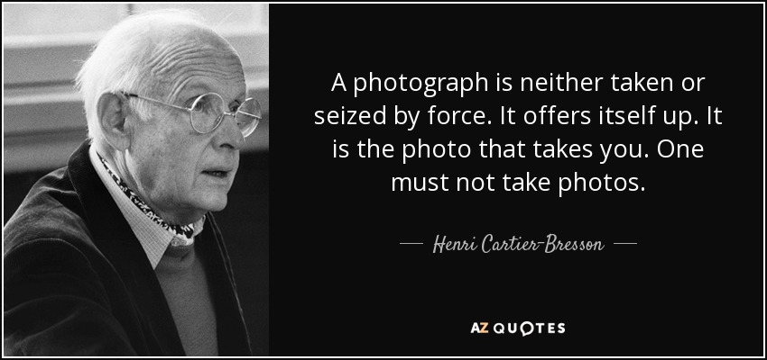 A photograph is neither taken or seized by force. It offers itself up. It is the photo that takes you. One must not take photos.