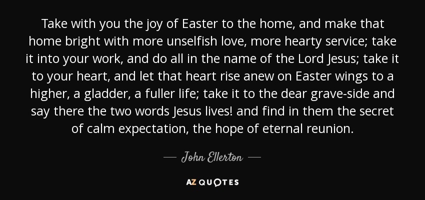 Take with you the joy of Easter to the home, and make that home bright with more unselfish love, more hearty service; take it into your work, and do all in the name of the Lord Jesus; take it to your heart, and let that heart rise anew on Easter wings to a higher, a gladder, a fuller life; take it to the dear grave-side and say there the two words Jesus lives! and find in them the secret of calm expectation, the hope of eternal reunion.