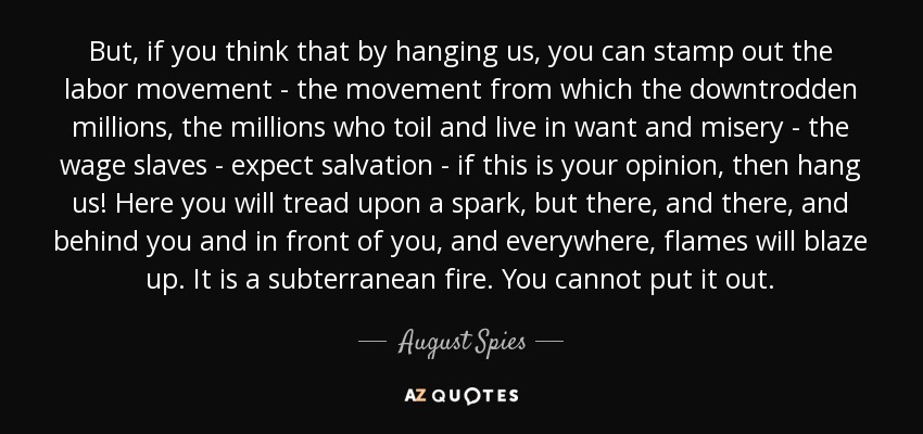 But, if you think that by hanging us, you can stamp out the labor movement - the movement from which the downtrodden millions, the millions who toil and live in want and misery - the wage slaves - expect salvation - if this is your opinion, then hang us! Here you will tread upon a spark, but there, and there, and behind you and in front of you, and everywhere, flames will blaze up. It is a subterranean fire. You cannot put it out.