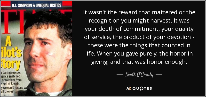 It wasn't the reward that mattered or the recognition you might harvest. It was your depth of commitment, your quality of service, the product of your devotion - these were the things that counted in life. When you gave purely, the honor in giving, and that was honor enough.