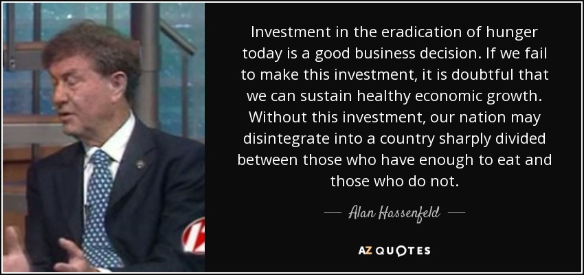 Investment in the eradication of hunger today is a good business decision. If we fail to make this investment, it is doubtful that we can sustain healthy economic growth. Without this investment, our nation may disintegrate into a country sharply divided between those who have enough to eat and those who do not.