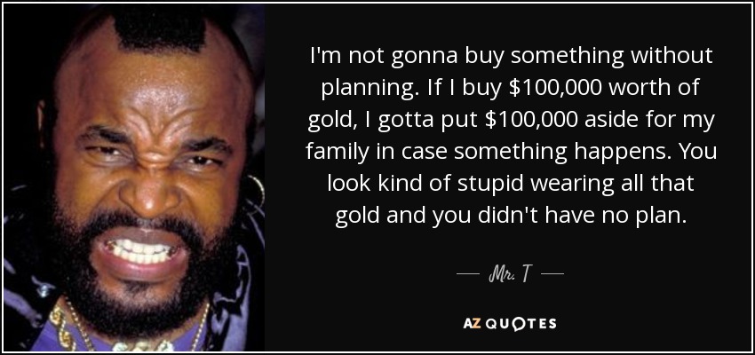 I'm not gonna buy something without planning. If I buy $100,000 worth of gold, I gotta put $100,000 aside for my family in case something happens. You look kind of stupid wearing all that gold and you didn't have no plan.