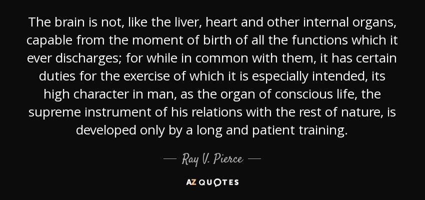 The brain is not, like the liver, heart and other internal organs, capable from the moment of birth of all the functions which it ever discharges; for while in common with them, it has certain duties for the exercise of which it is especially intended, its high character in man, as the organ of conscious life, the supreme instrument of his relations with the rest of nature, is developed only by a long and patient training.