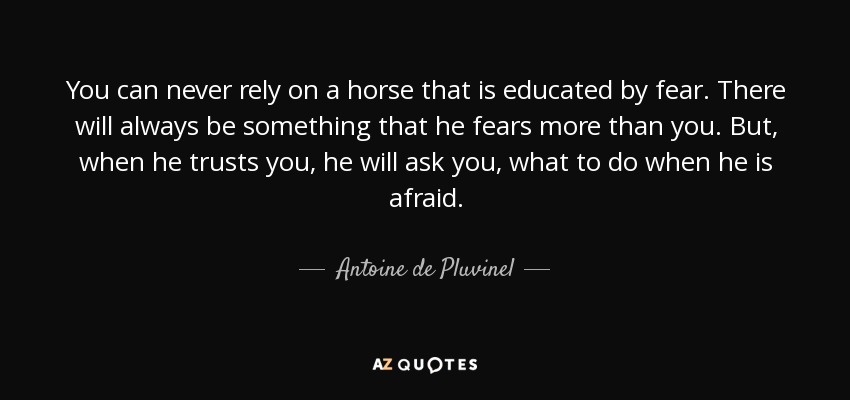 You can never rely on a horse that is educated by fear. There will always be something that he fears more than you. But, when he trusts you, he will ask you, what to do when he is afraid.