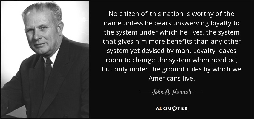 No citizen of this nation is worthy of the name unless he bears unswerving loyalty to the system under which he lives, the system that gives him more benefits than any other system yet devised by man. Loyalty leaves room to change the system when need be, but only under the ground rules by which we Americans live.