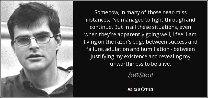 Somehow, in many of those near-miss instances, I've managed to fight through and continue. But in all these situations, even when they're apparently going well, I feel I am living on the razor's edge between success and failure, adulation and humiliation - between justifying my existence and revealing my unworthiness to be alive.