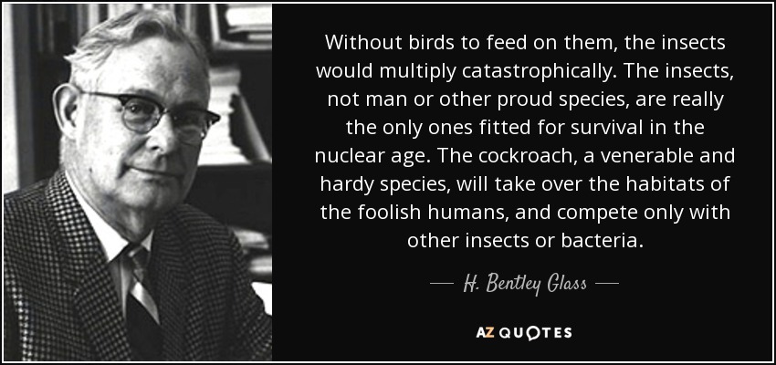 Without birds to feed on them, the insects would multiply catastrophically. The insects, not man or other proud species, are really the only ones fitted for survival in the nuclear age. The cockroach, a venerable and hardy species, will take over the habitats of the foolish humans, and compete only with other insects or bacteria.