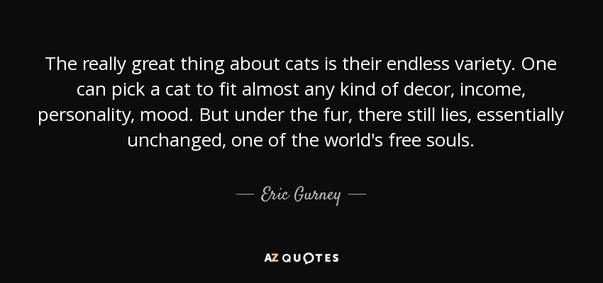 The really great thing about cats is their endless variety. One can pick a cat to fit almost any kind of decor, income, personality, mood. But under the fur, there still lies, essentially unchanged, one of the world's free souls.