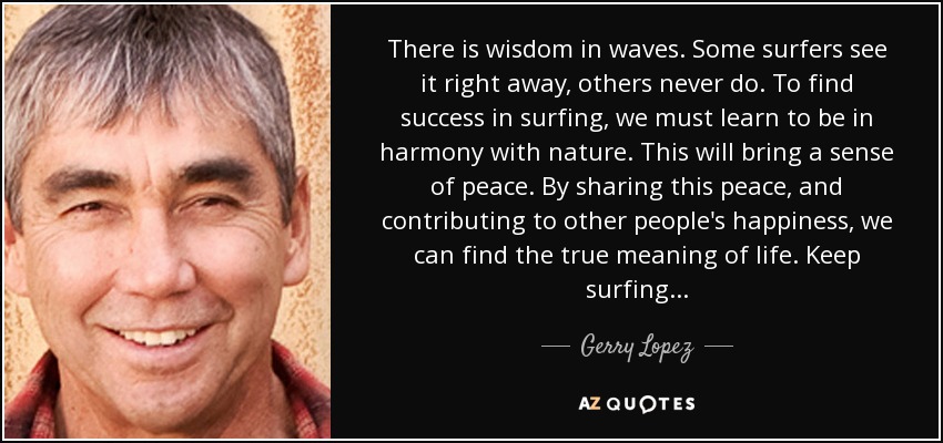There is wisdom in waves. Some surfers see it right away, others never do. To find success in surfing, we must learn to be in harmony with nature. This will bring a sense of peace. By sharing this peace, and contributing to other people's happiness, we can find the true meaning of life. Keep surfing . . .