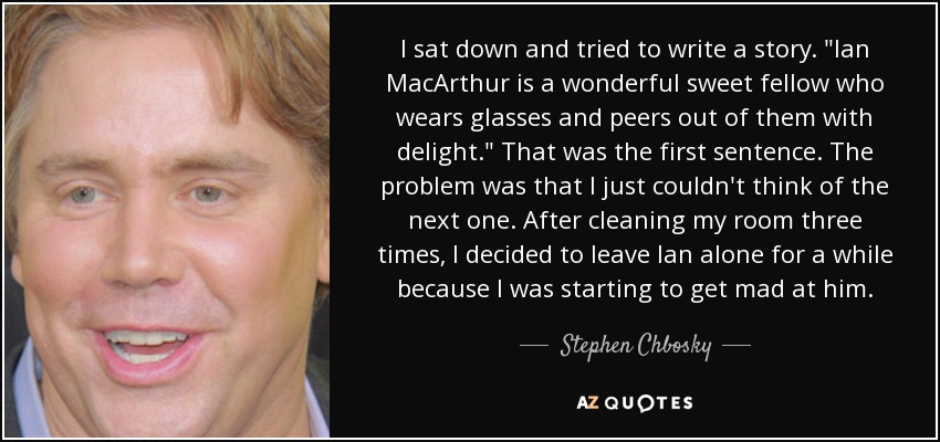 I sat down and tried to write a story. "Ian MacArthur is a wonderful sweet fellow who wears glasses and peers out of them with delight." That was the first sentence. The problem was that I just couldn't think of the next one. After cleaning my room three times, I decided to leave Ian alone for a while because I was starting to get mad at him.