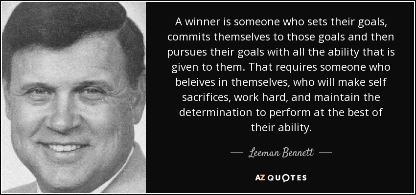 A winner is someone who sets their goals, commits themselves to those goals and then pursues their goals with all the ability that is given to them. That requires someone who beleives in themselves, who will make self sacrifices, work hard, and maintain the determination to perform at the best of their ability.