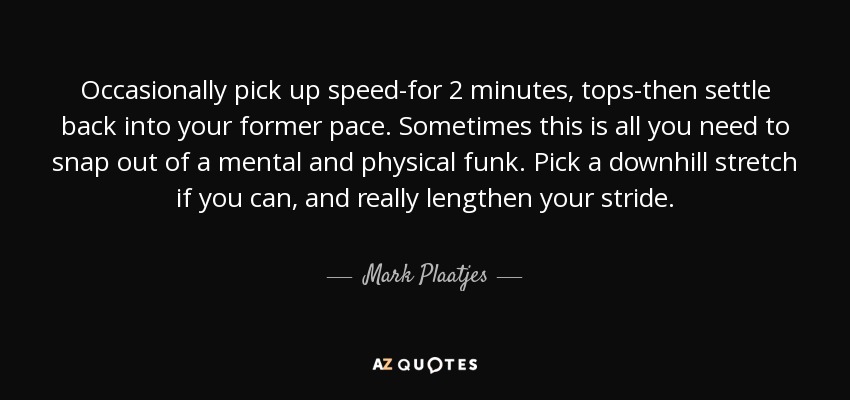 Occasionally pick up speed-for 2 minutes, tops-then settle back into your former pace. Sometimes this is all you need to snap out of a mental and physical funk. Pick a downhill stretch if you can, and really lengthen your stride.