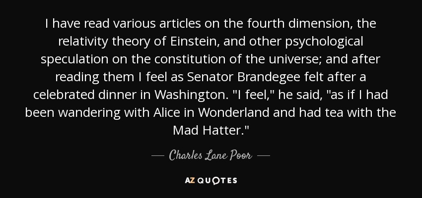 I have read various articles on the fourth dimension, the relativity theory of Einstein, and other psychological speculation on the constitution of the universe; and after reading them I feel as Senator Brandegee felt after a celebrated dinner in Washington. "I feel," he said, "as if I had been wandering with Alice in Wonderland and had tea with the Mad Hatter."