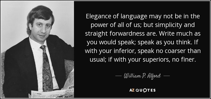 Elegance of language may not be in the power of all of us; but simplicity and straight forwardness are. Write much as you would speak; speak as you think. If with your inferior, speak no coarser than usual; if with your superiors, no finer.