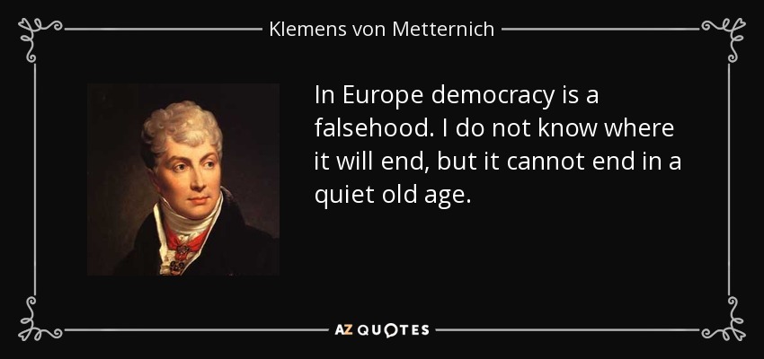 In Europe democracy is a falsehood. I do not know where it will end, but it cannot end in a quiet old age.