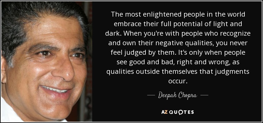 The most enlightened people in the world embrace their full potential of light and dark. When you're with people who recognize and own their negative qualities, you never feel judged by them. It's only when people see good and bad, right and wrong, as qualities outside themselves that judgments occur.
