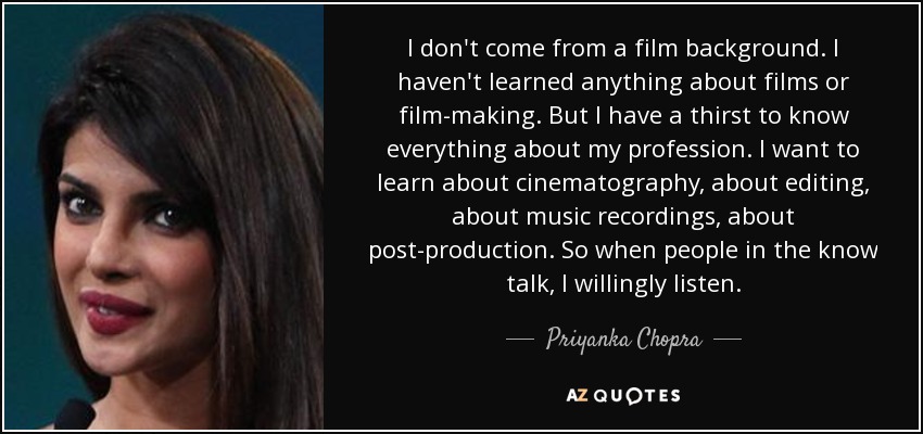 I don't come from a film background. I haven't learned anything about films or film-making. But I have a thirst to know everything about my profession. I want to learn about cinematography, about editing, about music recordings, about post-production. So when people in the know talk, I willingly listen.