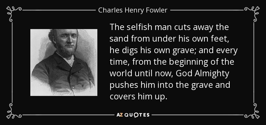 The selfish man cuts away the sand from under his own feet, he digs his own grave; and every time, from the beginning of the world until now, God Almighty pushes him into the grave and covers him up.