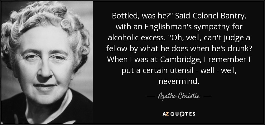 Bottled, was he?" Said Colonel Bantry, with an Englishman's sympathy for alcoholic excess. "Oh, well, can't judge a fellow by what he does when he's drunk? When I was at Cambridge, I remember I put a certain utensil - well - well, nevermind.
