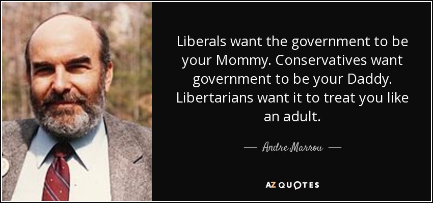 Liberals want the government to be your Mommy. Conservatives want government to be your Daddy. Libertarians want it to treat you like an adult.