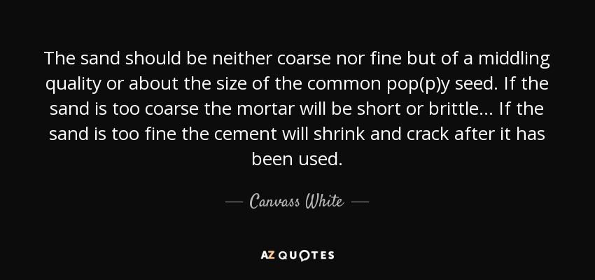 The sand should be neither coarse nor fine but of a middling quality or about the size of the common pop(p)y seed. If the sand is too coarse the mortar will be short or brittle . . . If the sand is too fine the cement will shrink and crack after it has been used.