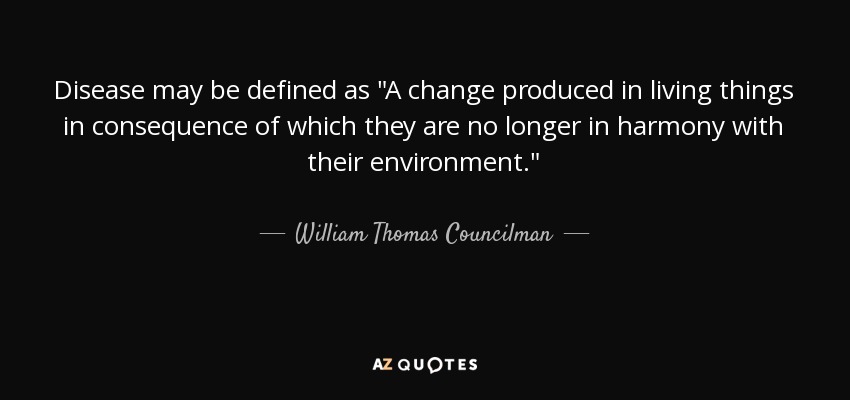 Disease may be defined as "A change produced in living things in consequence of which they are no longer in harmony with their environment."