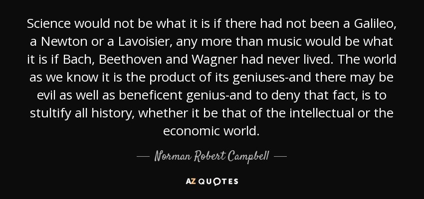 Science would not be what it is if there had not been a Galileo, a Newton or a Lavoisier, any more than music would be what it is if Bach, Beethoven and Wagner had never lived. The world as we know it is the product of its geniuses-and there may be evil as well as beneficent genius-and to deny that fact, is to stultify all history, whether it be that of the intellectual or the economic world.