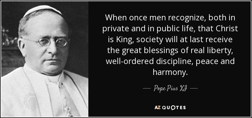 When once men recognize, both in private and in public life, that Christ is King, society will at last receive the great blessings of real liberty, well-ordered discipline, peace and harmony.