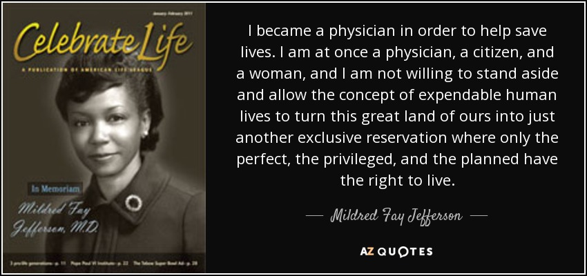 I became a physician in order to help save lives. I am at once a physician, a citizen, and a woman, and I am not willing to stand aside and allow the concept of expendable human lives to turn this great land of ours into just another exclusive reservation where only the perfect, the privileged, and the planned have the right to live.