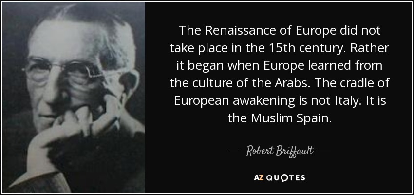 The Renaissance of Europe did not take place in the 15th century. Rather it began when Europe learned from the culture of the Arabs. The cradle of European awakening is not Italy. It is the Muslim Spain.