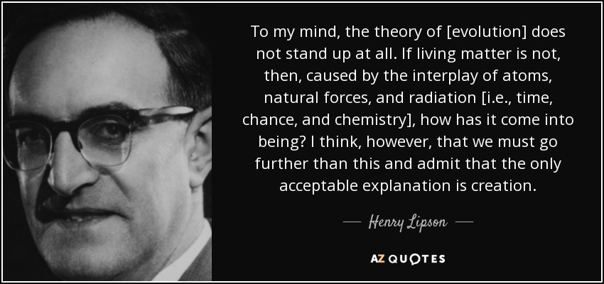 To my mind, the theory of [evolution] does not stand up at all. If living matter is not, then, caused by the interplay of atoms, natural forces, and radiation [i.e., time, chance, and chemistry], how has it come into being? I think, however, that we must go further than this and admit that the only acceptable explanation is creation.