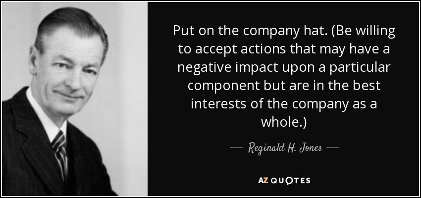 Put on the company hat. (Be willing to accept actions that may have a negative impact upon a particular component but are in the best interests of the company as a whole.)