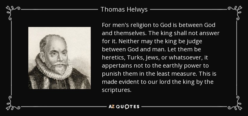 For men's religion to God is between God and themselves. The king shall not answer for it. Neither may the king be judge between God and man. Let them be heretics, Turks, Jews, or whatsoever, it appertains not to the earthly power to punish them in the least measure. This is made evident to our lord the king by the scriptures.